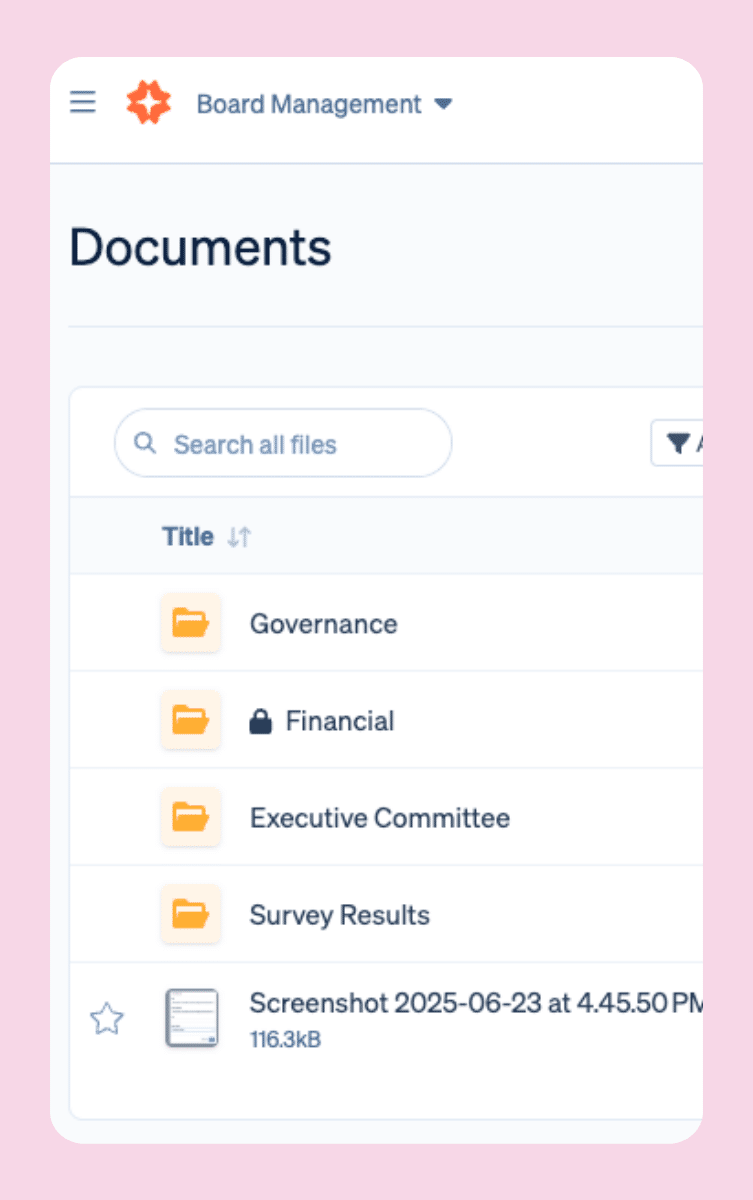 Centralized, searchable, and secure—built for nonprofit boards that need one source of truth for every file.